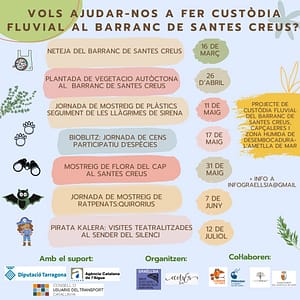 Un any mes engeguem la campanya a favor de la conservació mediambiental del Barranc de Santes Creus (BSC), amb un calendari de propostes de ciència ciudatana, neteja de lleres, atansament a la natura, mostrejos i moltes d’altres accions adreçades a famílies, voluntaris i públic en general que ens vulguin acompanyar en cap de setmana a conèixer el nostre entorn proper i alhora gaudir-ne i convertir-se en custodi dels seus valors naturals i patrimonials.
